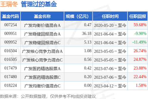 王瑞冬先生:清华大学工学硕士。曾任中国人寿资产管理有限公司医药行业研究员,广发基金管理有限公司研究发展部行业研究员。现任广发基金管理有限公司基金经理助理。自2020年4月15日起任广发均衡价值混合型证券投资基金的基金经理助理。2020年5月20日起担任广发均衡价值混合型证券投资基金基金经理。2020年6月2日至2024年4月10日担任广发稳健增长开放式证券投资基金基金经理助理。2020年10月21日起担任广发稳健回报混合型证券投资基金的基金经理助理。