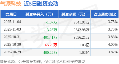 证券之星消息,11月4日,气派科技(688216)融资买入471.07万元,融资偿还472.14万元,融资净卖出1.07万元,融资余额9841.91万元。