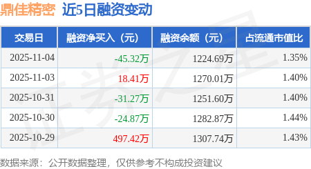 证券之星消息,11月4日,鼎佳精密(920005)融资买入37.97万元,融资偿还83.28万元,融资净卖出45.32万元,融资余额1224.69万元。