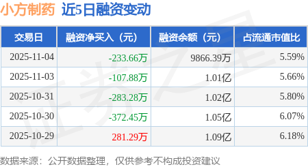 证券之星消息,11月4日,小方制药(603207)融资买入183.44万元,融资偿还417.1万元,融资净卖出233.66万元,融资余额9866.39万元。