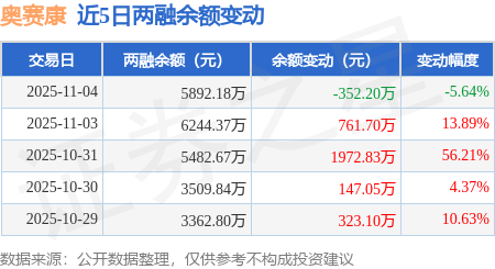 证券之星消息,11月4日,奥赛康(002755)融资买入1878.38万元,融资偿还2267.9万元,融资净卖出389.52万元,融资余额5849.56万元,近20个交易日中有11个交易日出现融资净买入。
