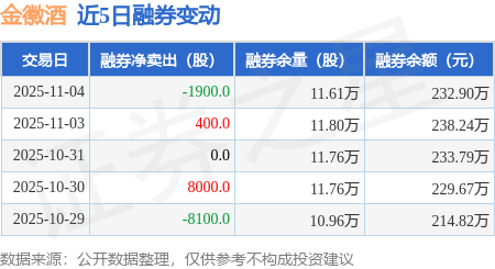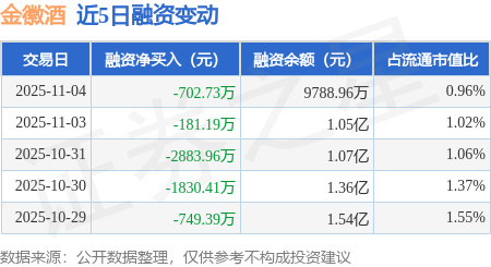 证券之星消息,11月4日,金徽酒(603919)融资买入539.06万元,融资偿还1241.8万元,融资净卖出702.73万元,融资余额9788.96万元。