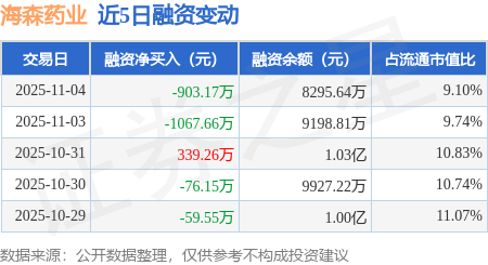 证券之星消息,11月4日,海森药业(001367)融资买入449.32万元,融资偿还1352.49万元,融资净卖出903.17万元,融资余额8295.64万元。