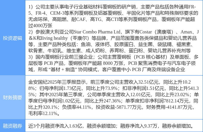 该股为铜箔/覆铜板,PCB板,食品概念热股,当日铜箔/覆铜板概念上涨2.28%,PCB板概念上涨1.07%,食品概念上涨0.71%。