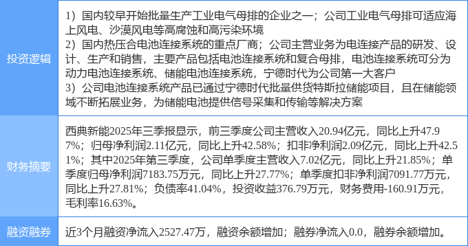 证券之星消息,西典新能11月5日涨停收盘,收盘价58.69元。该股于13点1分涨停,9次打开涨停,截止收盘封单资金为656.15万元,占其流通市值0.22%。