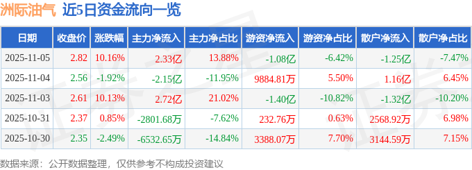 证券之星消息,洲际油气11月5日涨停收盘,收盘价2.82元。该股于9点49分涨停,6次打开涨停,截止收盘封单资金为3925.62万元,占其流通市值0.34%。