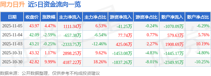 证券之星消息,截至2025年11月5日收盘,同力日升(605286)报收于43.97元,上涨4.47%,换手率2.34%,成交量3.93万手,成交额1.7亿元。