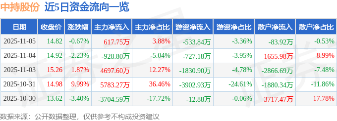 11月5日的资金流向数据方面,主力资金净流入617.75万元,占总成交额3.88%,游资资金净流出533.84万元,占总成交额3.36%,散户资金净流出83.92万元,占总成交额0.53%。