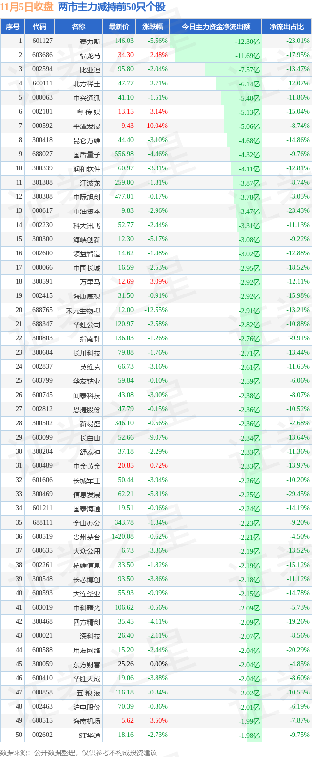 两市主力减持最多的前十只个股为: