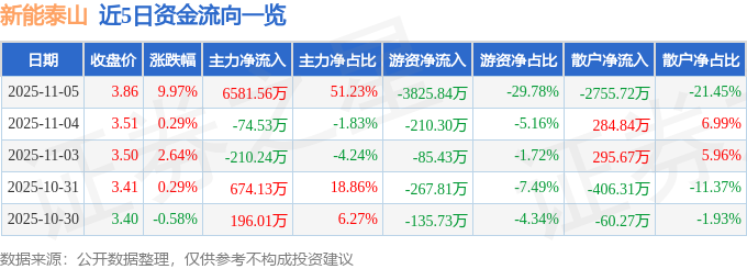 证券之星消息,新能泰山11月5日涨停收盘,收盘价3.86元。该股于9点36分涨停,未打开涨停,截止收盘封单资金为6322.23万元,占其流通市值1.3%。