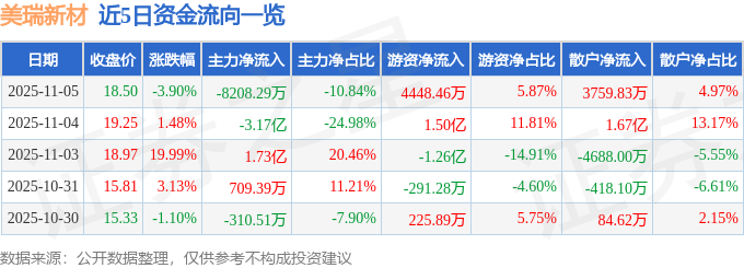 证券之星消息,截至2025年11月5日收盘,美瑞新材(300848)报收于18.5元,下跌3.9%,换手率16.41%,成交量41.53万手,成交额7.57亿元。