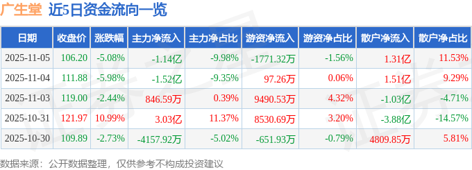 证券之星消息,截至2025年11月5日收盘,广生堂(300436)报收于106.2元,下跌5.08%,换手率7.75%,成交量10.6万手,成交额11.39亿元。