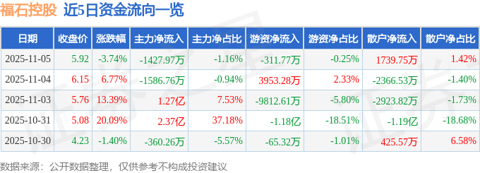 证券之星消息,截至2025年11月5日收盘,福石控股(300071)报收于5.92元,下跌3.74%,换手率21.96%,成交量207.56万手,成交额12.28亿元。