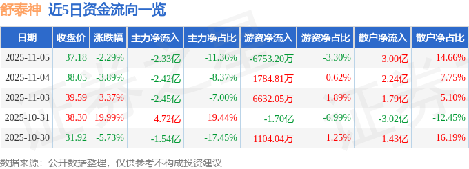 证券之星消息,截至2025年11月5日收盘,舒泰神(300204)报收于37.18元,下跌2.29%,换手率12.14%,成交量55.07万手,成交额20.47亿元。