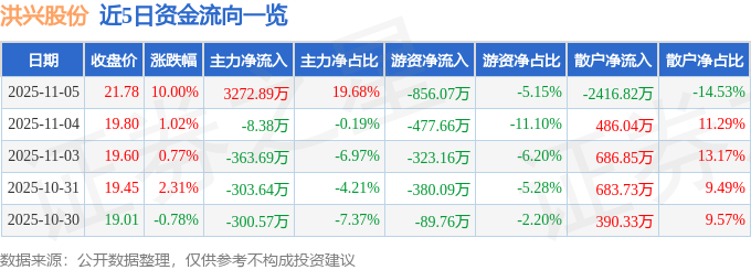11月5日的资金流向数据方面,主力资金净流入3272.89万元,占总成交额19.68%,游资资金净流出856.07万元,占总成交额5.15%,散户资金净流出2416.82万元,占总成交额14.53%。