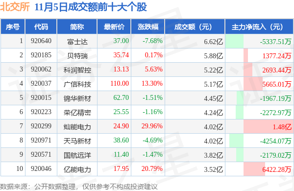 当日北交所成交额前10大个股中5只个股收涨,平均涨幅13.97%,其中富士达(920640)以成交额6.62亿元排第一。从主力资金流入看,成交额前10大个股中有5只个股呈现主力资金净流入。