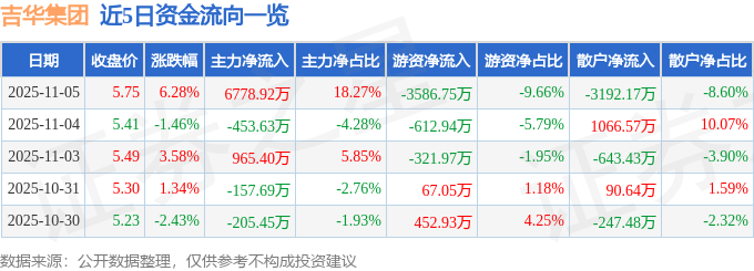 证券之星消息,截至2025年11月5日收盘,吉华集团(603980)报收于5.75元,上涨6.28%,换手率9.62%,成交量65.1万手,成交额3.71亿元。