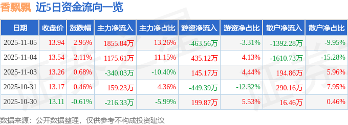 11月5日的资金流向数据方面,主力资金净流入1855.84万元,占总成交额13.26%,游资资金净流出463.56万元,占总成交额3.31%,散户资金净流出1392.28万元,占总成交额9.95%。