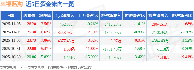证券之星消息,截至2025年11月5日收盘,幸福蓝海(300528)报收于26.2元,上涨3.56%,换手率17.89%,成交量66.67万手,成交额17.07亿元。