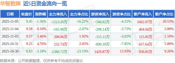 证券之星消息,截至2025年11月5日收盘,华智数媒(300426)报收于9.45元,下跌1.36%,换手率2.13%,成交量8.52万手,成交额8095.13万元。