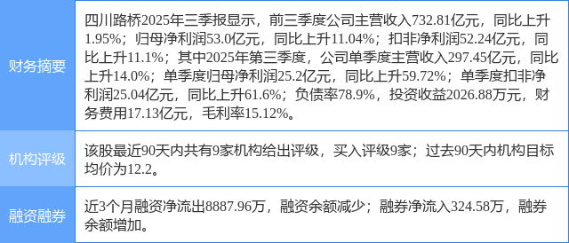2025年9月1日,天风证券研究员鲍荣富,王涛,王雯发布了对四川路桥的研报《收入和利润阶段性承压,订单保持亮眼增速》,该研报对四川路桥给出“买入”评级。证券之星数据中心根据近三年发布的研报数据计算,该研报作者对此股的盈利预测准确度为76.15%。