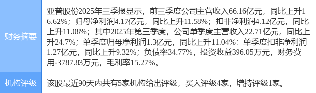 2025年11月4日,中邮证券研究员付秉正发布了对亚普股份的研报《25Q3业绩符合预期,燃油系统主业竞争力增强》,该研报对亚普股份给出“买入”评级。研报中预计2025-2027年营收为89.25/98.90/109.02亿元,归母净利润为5.57/6.21/7.12亿元,当前股价对应PE为21.8/19.5/17.1倍维持“买入”评级。证券之星数据中心根据近三年发布的研报数据计算,该研报作者对此股的盈利预测准确度为73.3%。