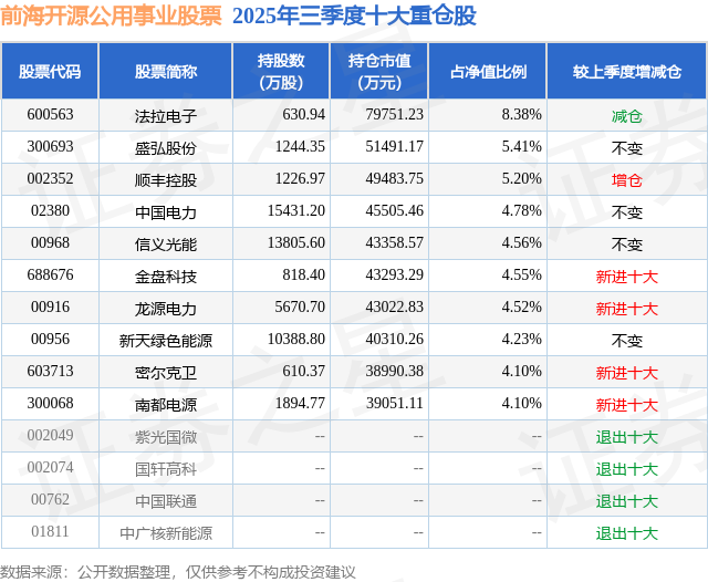 根据2025基金Q3季报公募基金重仓股数据,重仓该股的公募基金共17家,其中持有数量最多的公募基金为前海开源基金的前海开源公用事业股票。前海开源公用事业股票目前规模为95.19亿元,最新净值3.3419(11月4日),较上一交易日下跌0.93%,近一年上涨31.92%。该公募基金现任基金经理为崔宸龙。崔宸龙在任的基金产品包括:前海开源沪港深非周期股票A,管理时间为2020年7月20日至今,期间收益率为18.24%;前海开源新经济混合A,管理时间为2020年10月27日至今,期间收益率为98.39%;前海开源沪港深智慧生活混合,管理时间为2021年6月24日至今,期间收益率为-17.45%。