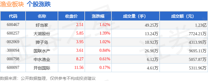 证券之星消息,11月5日渔业板块较上一交易日上涨0.96%,好当家领涨。当日上证指数报收于3969.25,上涨0.23%。深证成指报收于13223.56,上涨0.37%。渔业板块个股涨跌见下表: