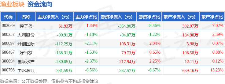 从资金流向上来看,当日渔业板块主力资金净流出891.22万元,游资资金净流出390.56万元,散户资金净流入1281.77万元。渔业板块个股资金流向见下表: