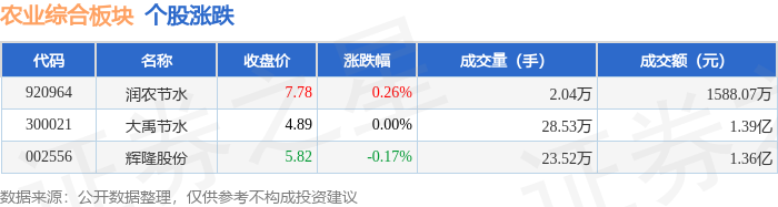 证券之星消息,11月5日农业综合板块较上一交易日下跌0.1%,辉隆股份领跌。当日上证指数报收于3969.25,上涨0.23%。深证成指报收于13223.56,上涨0.37%。农业综合板块个股涨跌见下表:
