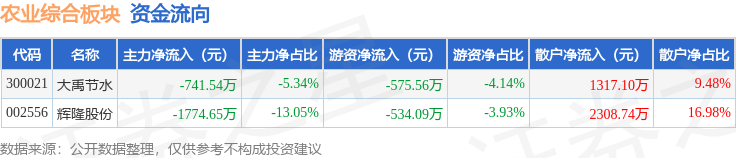 从资金流向上来看,当日农业综合板块主力资金净流出2516.19万元,游资资金净流出1109.65万元,散户资金净流入3625.84万元。农业综合板块个股资金流向见下表: