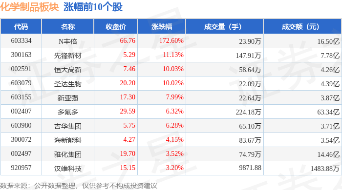 证券之星消息,11月5日化学制品板块较上一交易日上涨0.32%,N丰倍领涨。当日上证指数报收于3969.25,上涨0.23%。深证成指报收于13223.56,上涨0.37%。化学制品板块个股涨跌见下表: