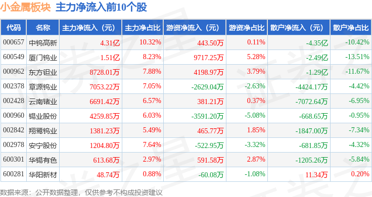 从资金流向上来看,当日小金属板块主力资金净流出2.2亿元,游资资金净流入2.47亿元,散户资金净流出2687.68万元。小金属板块个股资金流向见下表: