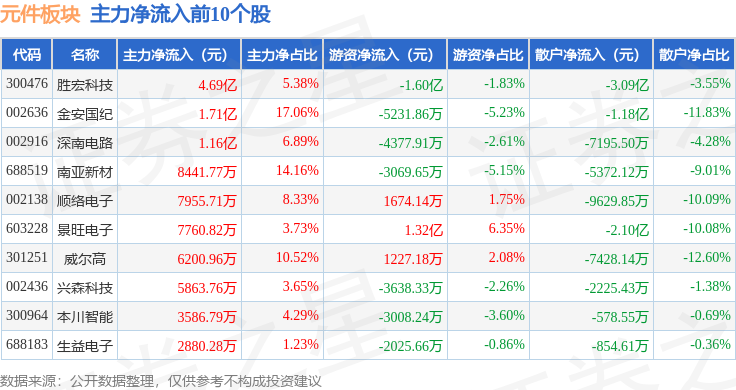 从资金流向上来看,当日元件板块主力资金净流入3.98亿元,游资资金净流入7140.52万元,散户资金净流出4.7亿元。元件板块个股资金流向见下表: