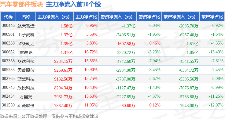 从资金流向上来看,当日汽车零部件板块主力资金净流出2792.76万元,游资资金净流出4.7亿元,散户资金净流入4.98亿元。汽车零部件板块个股资金流向见下表: