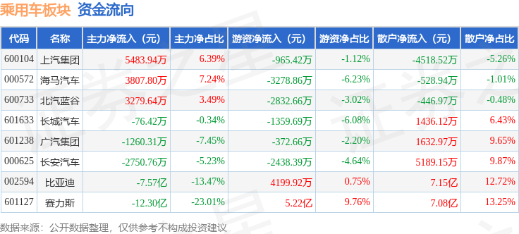 从资金流向上来看,当日乘用车板块主力资金净流出19.02亿元,游资资金净流入4.51亿元,散户资金净流入14.5亿元。乘用车板块个股资金流向见下表: