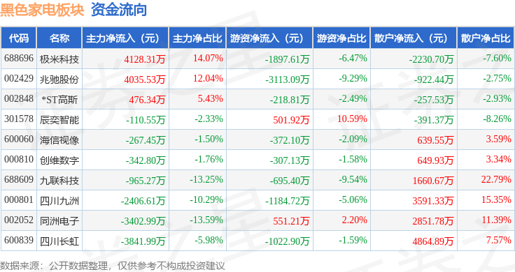 从资金流向上来看,当日黑色家电板块主力资金净流出2697.48万元,游资资金净流出7758.64万元,散户资金净流入1.05亿元。黑色家电板块个股资金流向见下表: