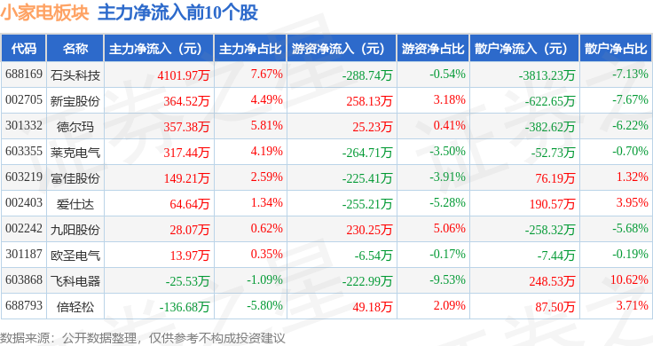从资金流向上来看,当日小家电板块主力资金净流出2705.38万元,游资资金净流出18.65万元,散户资金净流入2724.03万元。小家电板块个股资金流向见下表:
