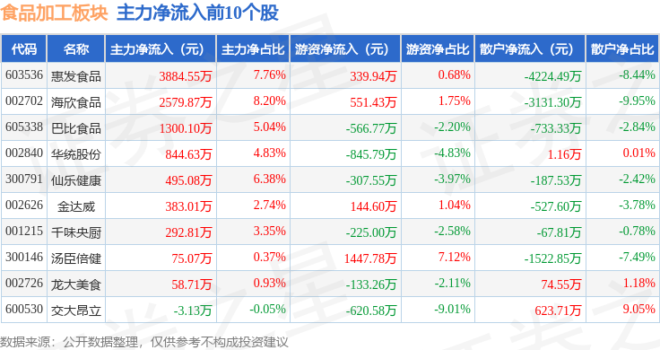 从资金流向上来看,当日食品加工板块主力资金净流入3912.43万元,游资资金净流入5067.63万元,散户资金净流出8980.06万元。食品加工板块个股资金流向见下表: