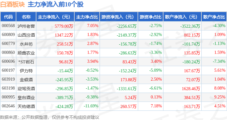 从资金流向上来看,当日白酒板块主力资金净流出5.24亿元,游资资金净流入2.03亿元,散户资金净流入3.21亿元。白酒板块个股资金流向见下表: