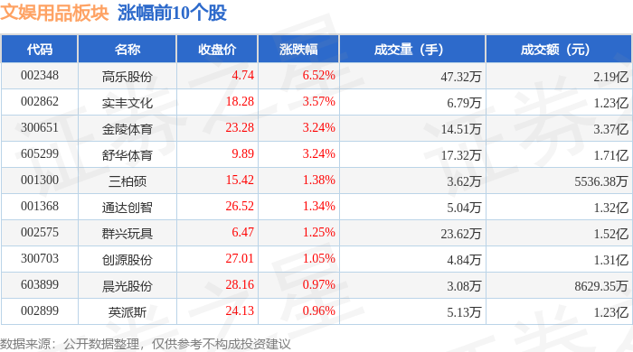 证券之星消息,11月5日文娱用品板块较上一交易日上涨0.87%,高乐股份领涨。当日上证指数报收于3969.25,上涨0.23%。深证成指报收于13223.56,上涨0.37%。文娱用品板块个股涨跌见下表: