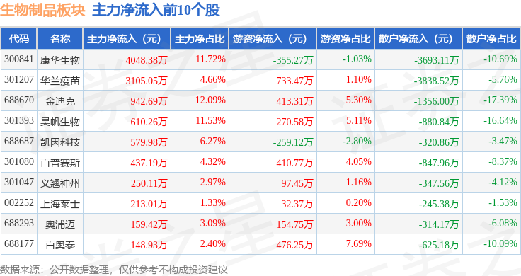 从资金流向上来看,当日生物制品板块主力资金净流出6.68亿元,游资资金净流入2.88亿元,散户资金净流入3.8亿元。生物制品板块个股资金流向见下表: