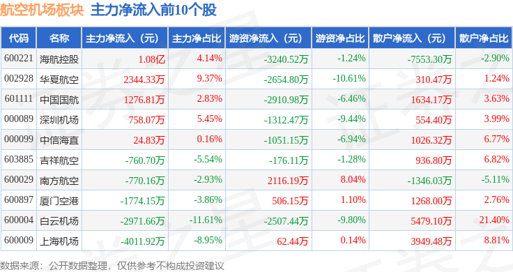 从资金流向上来看,当日航空机场板块主力资金净流出1.18亿元,游资资金净流出1292.87万元,散户资金净流入1.31亿元。航空机场板块个股资金流向见下表: