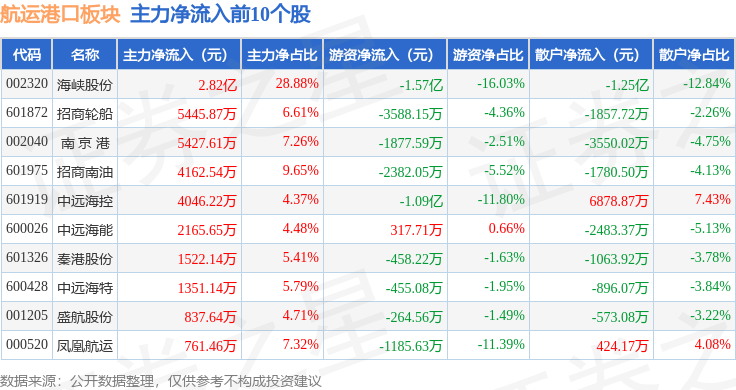 从资金流向上来看,当日航运港口板块主力资金净流入2.88亿元,游资资金净流出3.22亿元,散户资金净流入3371.85万元。航运港口板块个股资金流向见下表: