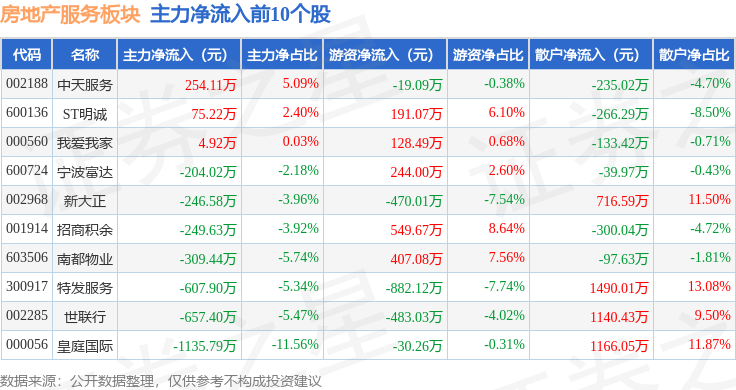 从资金流向上来看,当日房地产服务板块主力资金净流出7559.96万元,游资资金净流出474.8万元,散户资金净流入8034.76万元。房地产服务板块个股资金流向见下表: