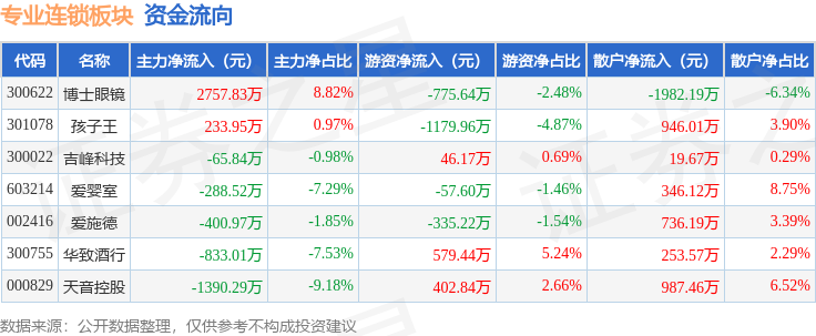 从资金流向上来看,当日专业连锁板块主力资金净流入13.14万元,游资资金净流出1319.97万元,散户资金净流入1306.83万元。专业连锁板块个股资金流向见下表: