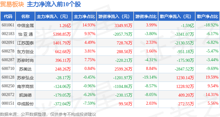 从资金流向上来看,当日贸易板块主力资金净流入1.81亿元,游资资金净流入2512.16万元,散户资金净流出2.07亿元。贸易板块个股资金流向见下表: