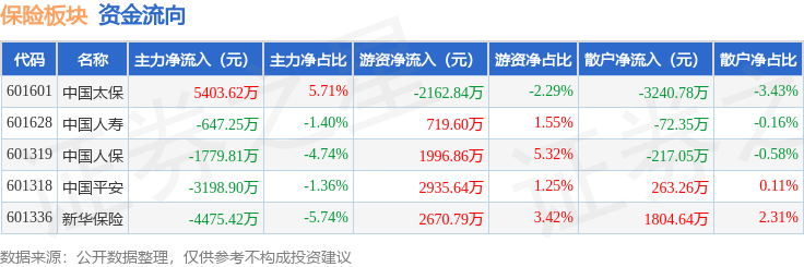 从资金流向上来看,当日保险板块主力资金净流出4697.77万元,游资资金净流入6160.05万元,散户资金净流出1462.28万元。保险板块个股资金流向见下表: