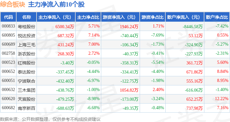 从资金流向上来看,当日综合板块主力资金净流出1.7亿元,游资资金净流出4419.77万元,散户资金净流入2.15亿元。综合板块个股资金流向见下表: