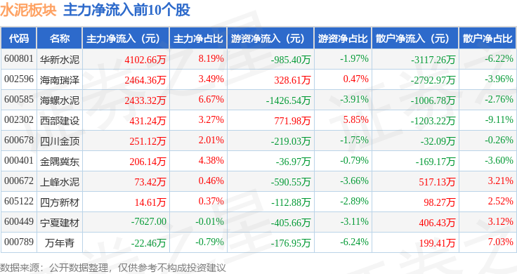 从资金流向上来看,当日水泥板块主力资金净流出7815.52万元,游资资金净流入4399.01万元,散户资金净流入3416.5万元。水泥板块个股资金流向见下表: